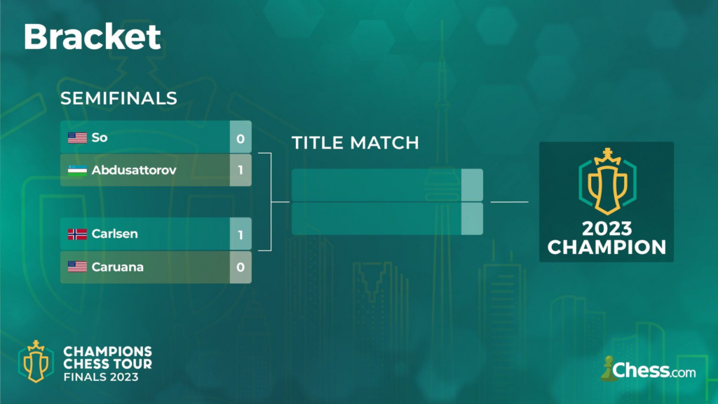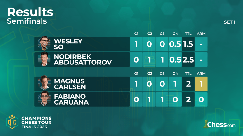 Los grandes maestros Magnus Carlsen y Nodirbek Abdusattorov tomaron la delantera en las semifinales del Champions Chess Tour 2023.
